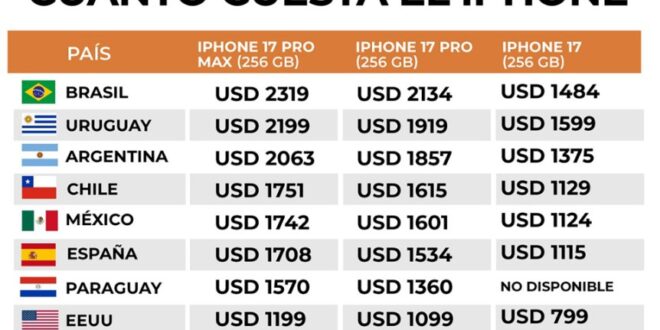 En México, en tanto, el iPhone 17 Pro Max tiene un precio de USD 1.742,64 (30.999 pesos mexicanos), el iPhone 17 Pro de USD 1.601,91 (28.499 pesos mexicanos) y el iPhone 17 de USD 1.124,13 (19.999 pesos mexicanos).