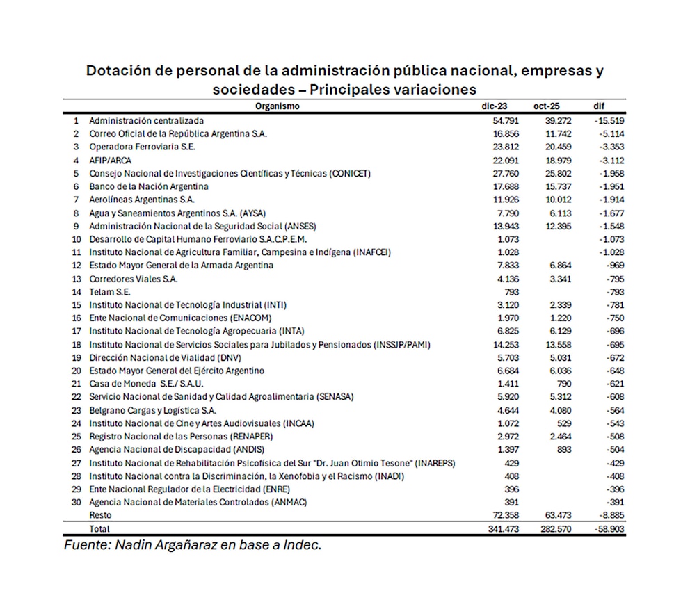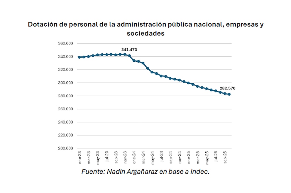 Según el documento, en octubre de 2025 el Estado contaba con 282.570 empleados, lo que refleja 58.903 puestos menos que los 341.473 existentes al inicio de la gestión. “Todos los meses hubo una caída respecto al mes previo”, indicó Argañaraz.