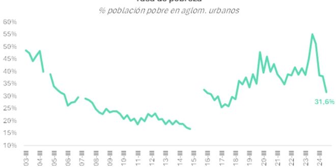 El último dato oficial, que difunde el organismo a cargo de Marco Lavagna, arrojó un alcance de la pobreza al 38,1% de las personas durante el segundo semestre del 2024, alcanzando así a 11,3 millones de personas. De esta manera, anotó una caída de 14,8 p.p. con respecto al primer semestre del año anterior (52,9%).